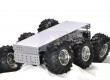 These two large (120mm-diameter) wheels from Dagu Electronics match those on the Dagu Wild Thumper chassis and can be used as replacement parts or for custom robots that need to traverse complex, rugged terrain. The black tires are made of soft, spiked rubber for increased traction, and the plastic hubs are chrome (silver) in color. The included adapters let you easily mount the wheels to motors with 4mm output shafts. These wheels are sold in pairs: you get two wheels, two 4mm adapters, and one 3mm hex wrench that matches the adapter screws.