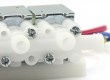 Bloque de 4 válvulas solenoide, con una entrada y 4 salidas de aire. Cada solenoide puede controlarse de manera independiente con una tensión de 12 VDC. El diámetro de la entrada y la salida es de 8mm.