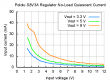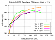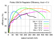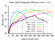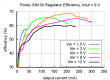 The efficiency of a voltage regulator, defined as (Power out)/(Power in), is an important measure of its performance, especially when battery life or heat are concerns. As shown in the graphs below, this switching regulator typically has an efficiency of 55% to 65%. The maximum achievable output current of the board depends on many factors, including the ambient temperature, air flow, heat sinking, and the input and output voltage. See the graphs below for more details on the typical efficiency and output currents for this voltage regulator.