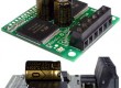 The dual motor driver PCB includes provisions for installing up to three large capacitors to limit disturbances on the main power line. Two 10mm radial capacitors may be mounted between the motor driver ICs, and an axial capacitor may be mounted between the ICs and power connections. It is generally not necessary to use all three capacitors; two radial capacitors are included with each unit. For applications that require a low profile, a single capacitor can be installed on its side as shown in the picture to the right.