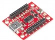 This board also breaks out each of the XBee’s I/O pins to a pair of breadboard-compatible headers. So if you want to make use of the XBee’s extended functionality, you can solder some header pins into those, or even just solder some wire.